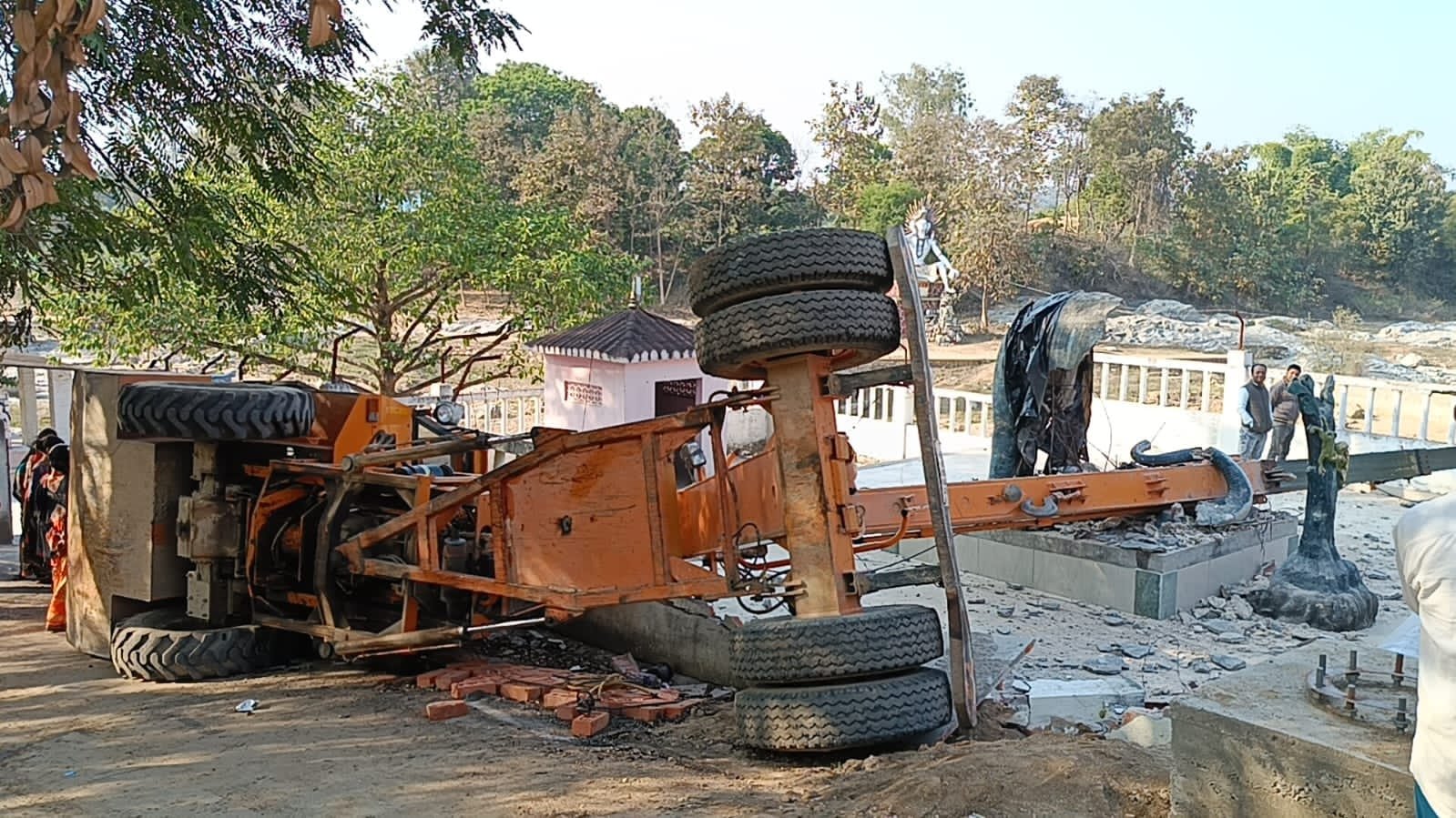 हाइड्रा अनियंत्रित होकर पलटा ,मंदिर की चहारदीवारी समेत आकर्षण का केंद्र बना हाथी का पुतला धराशायी